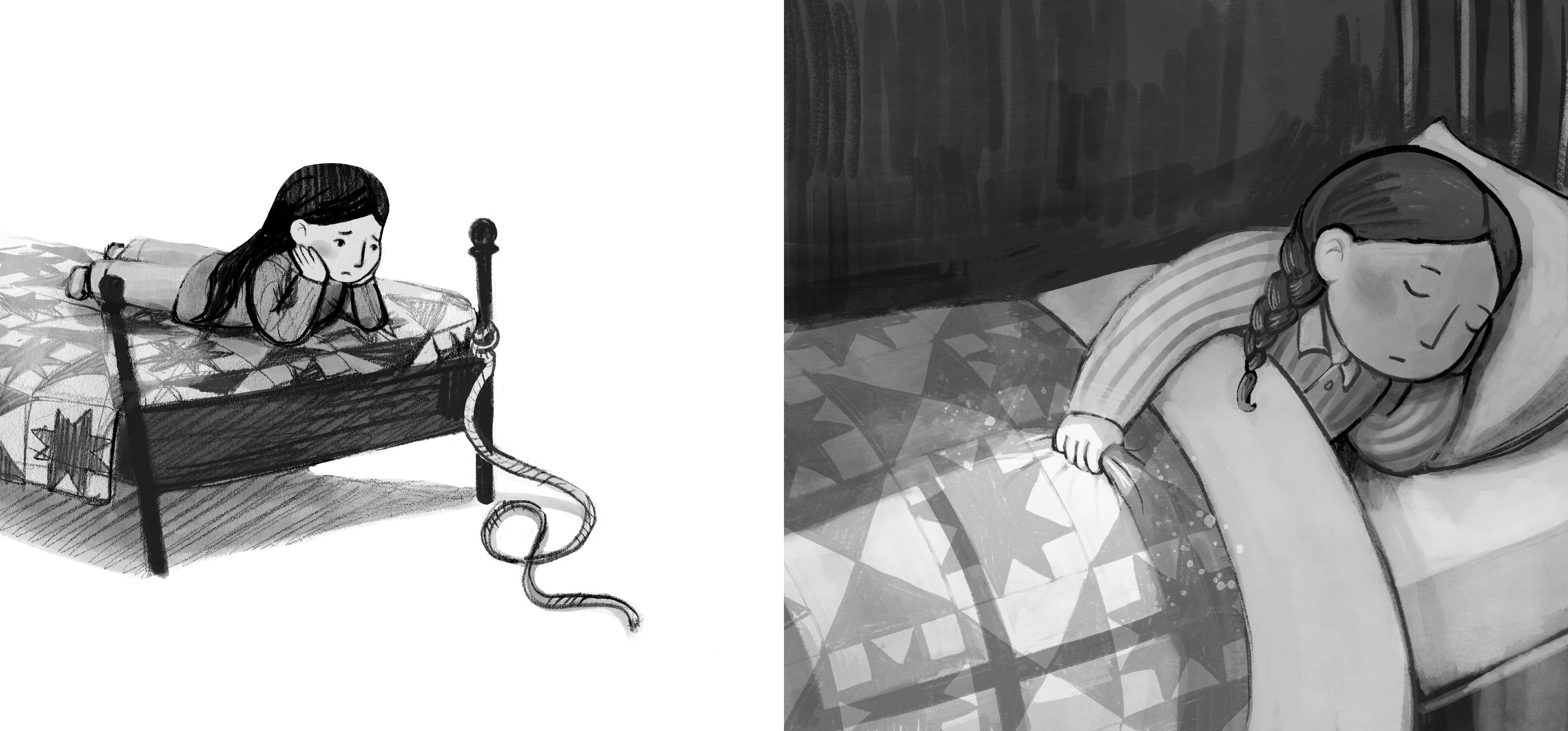 This story reflects my own childhood experience of losing my mother and learning to spend more time with my dad, but it can also relate to children with divorced parents, deployment, etc. Below are photographs documenting the handbound hardcover dummy and also the completed sample illustrations. These were created traditionally using gouache and colored pencil.